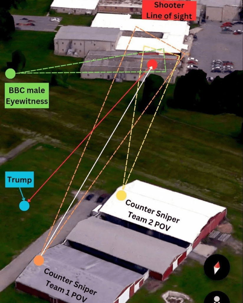 - Acting USSS Director Ronald Rowe stated on July 30, 2024 that “Neither the Secret Service counter sniper teams nor members of the former president’s security detail had any knowledge that there was a man on the roof.” This is in conflict with every other statement of people on the ground. Video HERE.