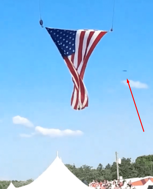 - At some point between the time Crooks was first sighted and when he ascended to his shooting perch, Crooks was able to again launch his drone, possibly seen to the right of the flag below. This was confirmed via the drone’s telemetry/GPS data. No images were stored on the drone.