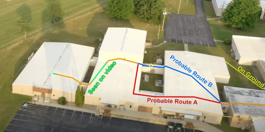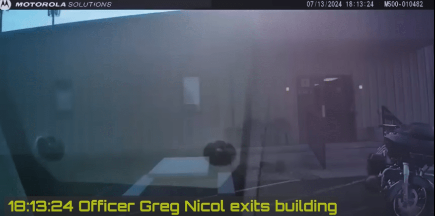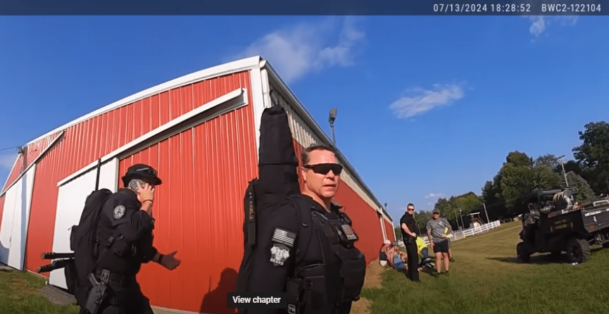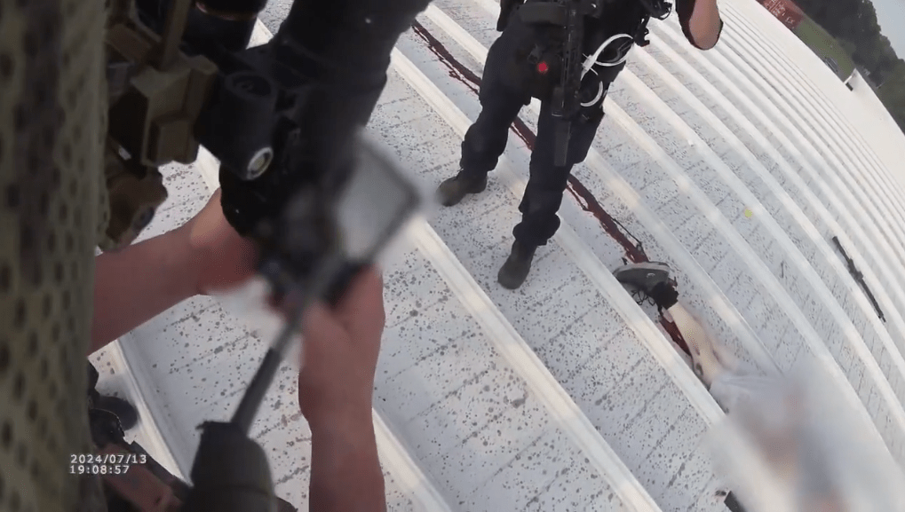 - 1810 – Two local LEOs attempted to confront Crooks on the roof. One LEO boosted the other up, and the boosted LEO grabbed the edge of the roof to pull himself up. Crooks then pointed his rifle at the LEO, who retreated as he physically could not draw his gun. The LEO fell as he did so (there has been claims that he was injured, but did not appear to be from the body camera footage below). The LEO then confirmed on the radio that there was a person on the roof who was armed shouting “LONG GUN” into the radio. This was initially denied by Acting USSS Director Rowe, who later clarified as noted above.