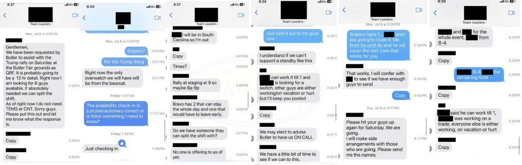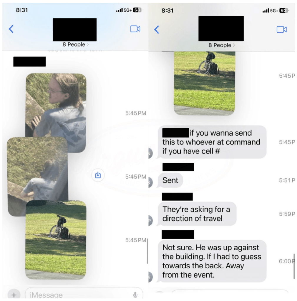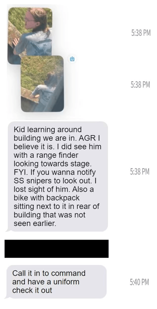 - 1753 – USSS C/S Team Leader texted the USSS C/S Team teams (Hercules 1 & 2) that Local LEOs were looking for a suspicious person outside of the perimeter, “lurking around the AGR building.” USSS personnel were operating with the knowledge that local law enforcement was working on an issue of a suspicious person.