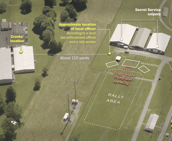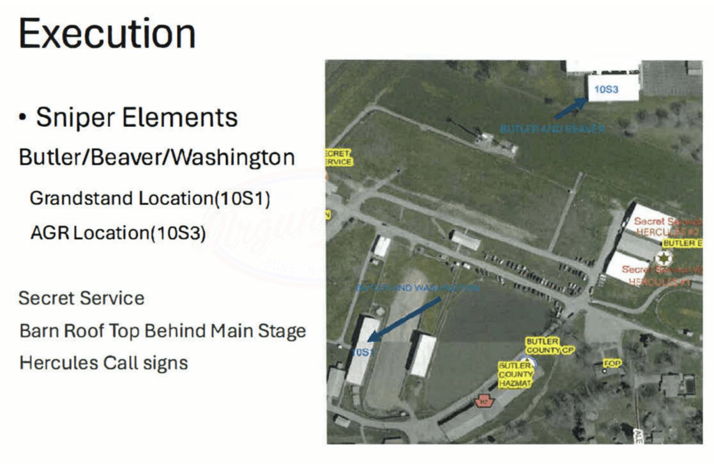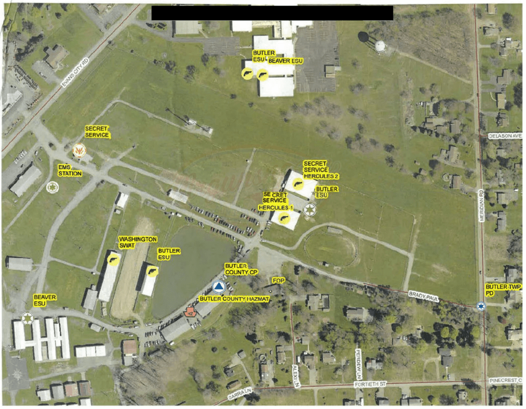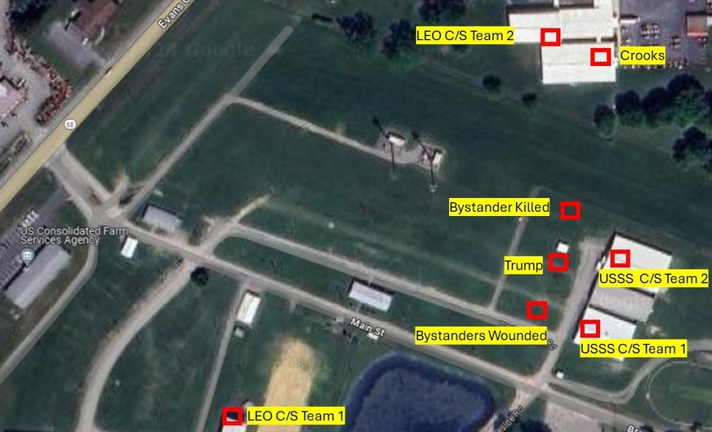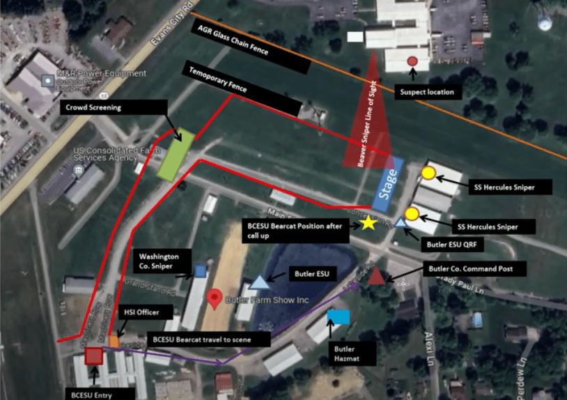- Initially, it was reported that Local LEO C/S Teams were assigned to take the position on the roof of the AGR International building by the USSS advance team, who directed them to establish their position in a 2nd-story window of an adjacent building rather than on the roof approximately a week prior to the event. (Note: Director Cheatle of the USSS has claimed that the team was not in place due to the roof being too sloped for safety, but also that it was a “well-known high priority vulnerability.” Several additional conflicting reports state that the Local LEOs told the USSS that they did not have the manpower present to man the positions, that the position was assigned to a team that simply did not show up, and that the team was inside the building due to heat.)