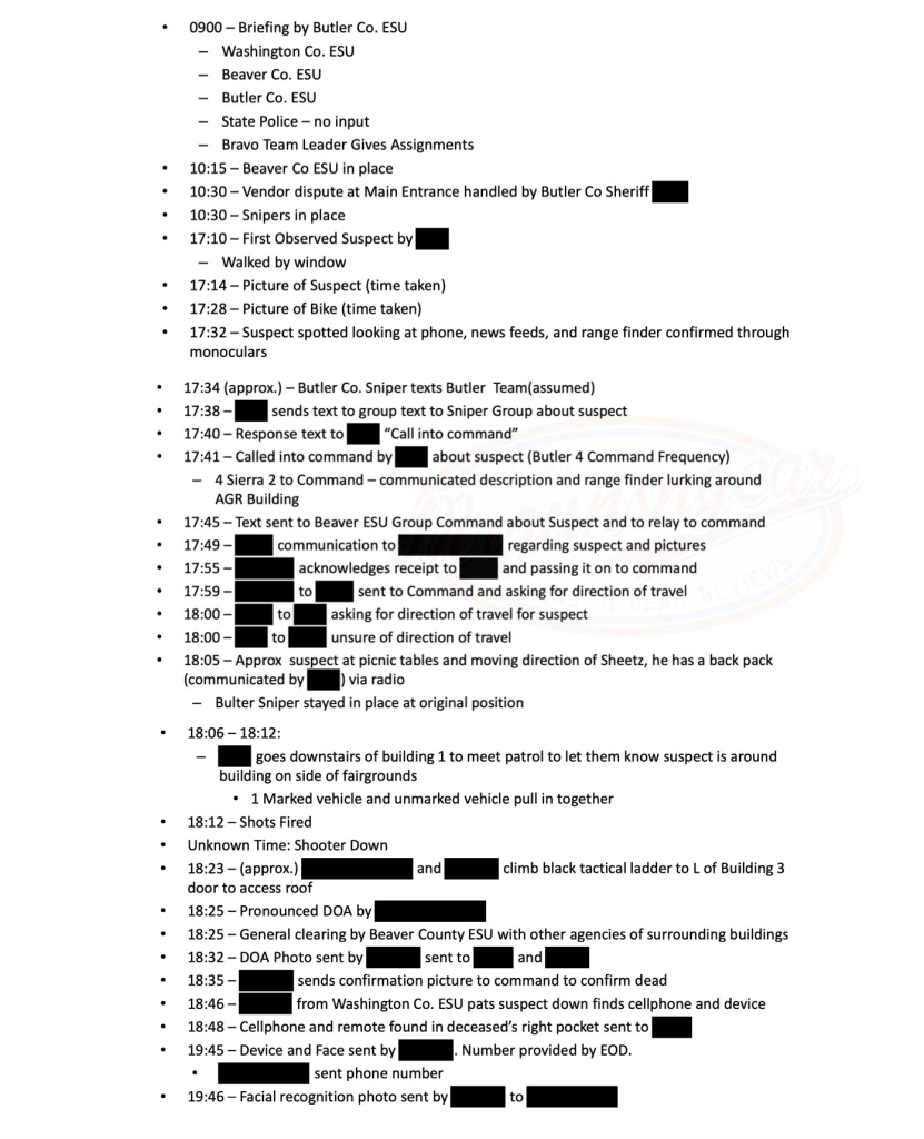 - A Congressional Investigation revealed that on several prior walkthroughs, Butler County ESU voiced concerns about the area, and the USSS Counter Sniper leaders repeatedly stated, “We will take care of it.”