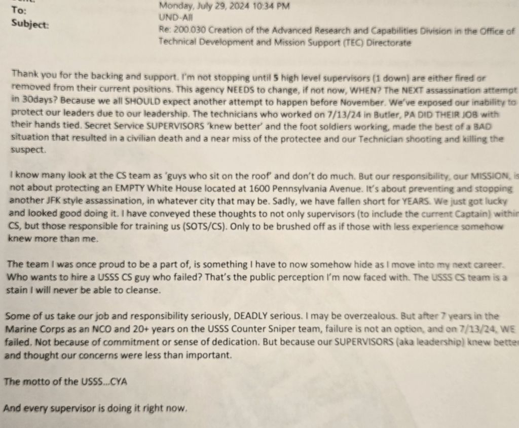 A Secret Service counter sniper sent an email on July 29, 2024 night to the entire Uniformed Division of the USSS (not agents) saying he will not stop speaking out until “5 high-level supervisors (1 down) are either fired or removed from their current positions.”