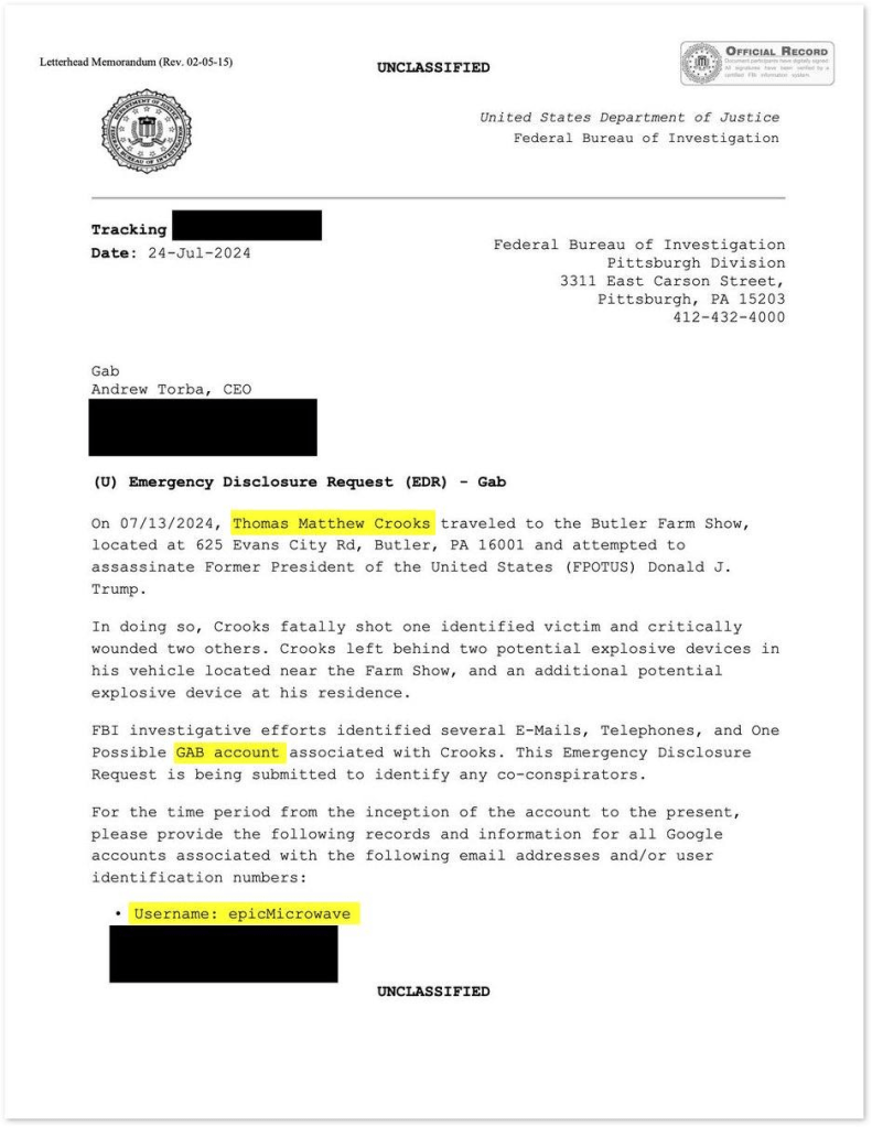 - Gab founder Andrew Torba then released an FBI Emergency Disclosure Request (EDR) that named Thomas Matthew Crooks’ Biden-supporting social media account.