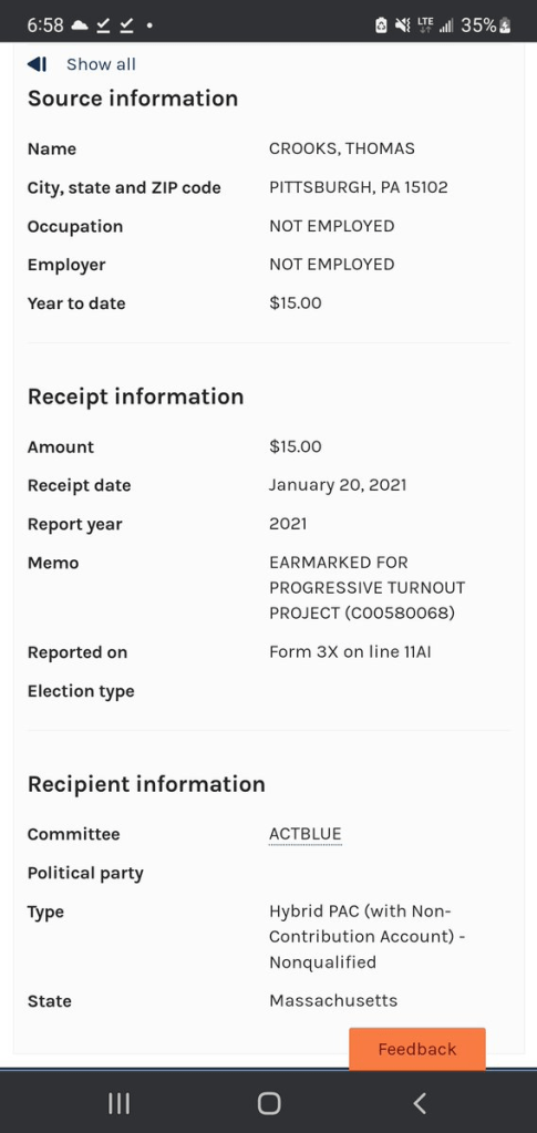 - Crooks was registered to vote as a Republican but donated to Progressive Turnout Project, a Democratic-aligned political action committee, on Inauguration Day in January 2021. – CNN (Note- the registration is most likely him attempting to participate in the “Primary” Trump effort by Democrats in closed primary states by registering and voting for an opposition candidate to prevent Trump’s nomination.)