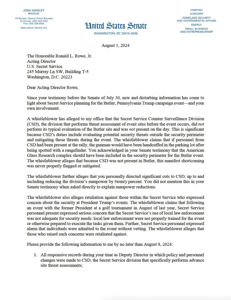 - Whistleblowers notified Senator Hawley (MO) that Acting USSS Director Rowe personally directed cuts to the USSS agents responsible for threat assessments while Deputy Director, and that none of these threat assessment agents were present in Butler when Trump was shot. Further many of them had been sounding the alarm about problems for months.