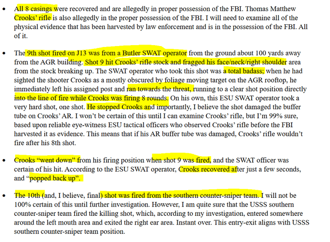 - A very good analysis of the sound signatures provides forensic proof that both the location and timing of the shots is consistent with the 8 shoots fired by Crooks, the single shot from the Butler SWAT Officer, and the single shot from USSS C/S Team 1.