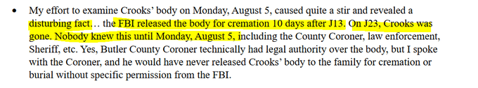 - The FBI also released Crooks body, which was quickly cremated, 10 days after the incident, and did not allow follow up examination of the body or autopsies.