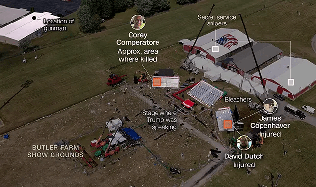 - Former Fire Chief Corey Comperatore, 50, covers his family with his own body during the first volley, and is shot in the head and killed in the second volley. US Marine Veteran of the Gulf War David “Jake” Dutch, 57 and James Copenhaver, 74, were both hit twice and survived. Dutch and Copenhaver have since been released from the hospital. All three were spectators at the event.