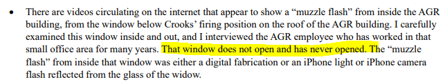 - Images that suggest that there was a “second shooter” in the window of the AGR International building downstairs due to muzzle flash, have been debunked, as that window is intact, and is a sealed window that was not able to be opened, as well as the fact that the window is too low to match the trajectory of the rounds.