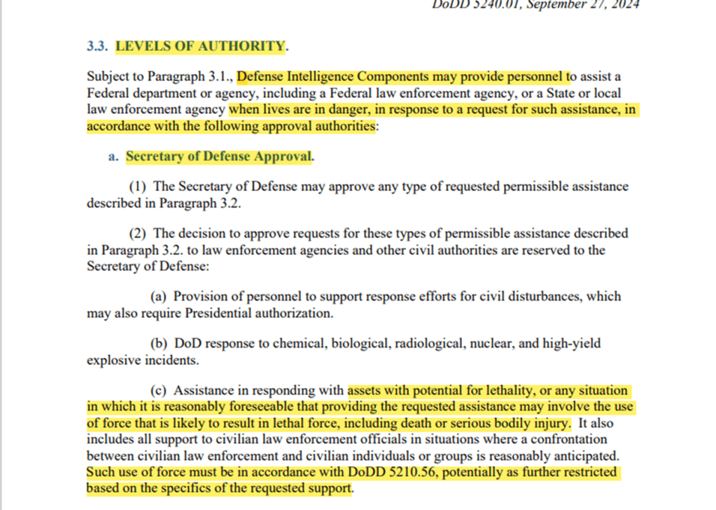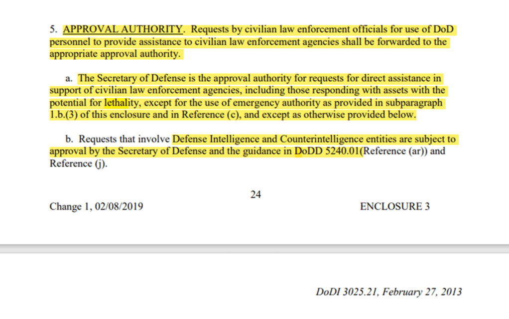 Nah, it is effectively the same restricted authorization for the US Military to assist agencies in DoD Issuance 3025.21 (Defense Support of Civilian Law Enforcement Agencies) of 2013 with 2019 update, which spells out the same approval authority. One should REALLY investigate this policy for the number of exceptions to the rule for SecDef authorization – it might shock you.