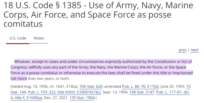 No again. While the PCA, (codified and revised in 18 U.S. Code § 1385) states that the US Military cannot be used to enforce the law (against civilians), there are VERY big exceptions to this law. Assistance at the behest of the State, Local, or Tribal governments, National Emergencies, Self Defense, and Insurrection/Rebellion just to name a few. The military can and has been used legally to assist in disasters, and other issues – and they have always had the right to use force as prudent under the law and per DoD directive.