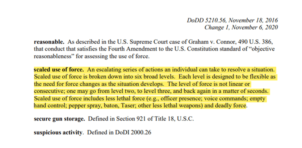 The fact is that this is specifically mitigated (and noted as such) by DoD Directive 5210.56 (Arming and Use of Force) of 2016 – where reasonableness of force, and scale of force is mandated, citing both Federal and SOCTUS case law.